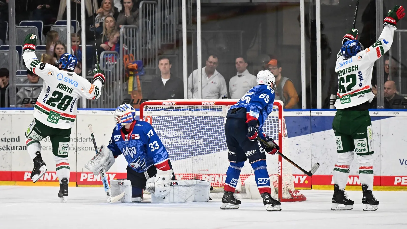 Es ging somit in die Overtime und dort dauerte es nur 24 Sekunden, ehe sich die Panther den Extrapunkt sicherten. Thomas Schemitsch passte in die Mitte, der Puck sprang in die Luft, aber Kunyk reagierte blitzschnell, pflückte sich die Scheibe und blieb dann mutterseelenallein vor dem Tor eiskalt und schoss zum 3:4 ein (61.).